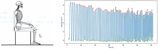 During the test, participants sat with their backs against a chair and feet flat on the ground. The tests were performed barefoot and an adjustable support placed beneath the feet was adjusted to ensure the thigh was approximately parallel with the floor and the calf was perpendicular to the floor. A thin rubber mat was positioned beneath their feet to avoid slippage during the test. Participants were instructed to raise their heels as high and fast as possible, lightly touching the ground on each cycle. The test was performed for 60 s, but no information regarding the test duration was disclosed. Participants chose which limb was assessed first, with the contralateral limb assessed approximately 1 min later. During the test, participants rested one hand flat on their lap (palm facing down) and held a smartphone (iPhone 13 pro, Apple, model A2638, Cupertino, CA, USA) on the distal part of their thigh. No apparatus was used to secure the smartphone (i.e., tapes or strings), and the smartphone was maintained in place by requesting the participant to keep his/her hand flat on the top of the device. The smartphone was positioned along the medial line of the segment with the screen facing upward, and the projection of the upper edge of the device coincided with the superior aspect of the patella bone. The smartphone’s gyroscope data (x-axis) were collected using commercial software (Sensor Log, version 5.3) using a sampling frequency of 60 Hz.