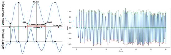 The ankle vertical displacement data (video) and the smartphone angular velocity data series (gyroscope) were time-synchronized so that the instant in which the first cycle was initiated was coincident in both data series. Then, the following instants were identified in the gyroscope data series: cycle initiation (INI—the zero-crossing instant before the peak positive angular velocity), maximum cycle vertical displacement (MAX—the zero-crossing instant after the peak positive angular velocity), and cycle termination (END—the zero-crossing after the peak negative angular velocity). The time between movement initiation (i.e., the instant heel rise begins) and maximum vertical displacement (i.e., the instant heel rise ends) was defined as the rising time (T-rise). The time between the maximum vertical displacement and the movement termination (the heel returns to the ground) was defined as the lowering time (T-lower). The total cycle time (T-total) was defined as the time between INI and END. In the video data series, INI was defined as the instant immediately prior to the ankle marker (y coordinate) raising from its lowest vertical displacement to initiate an upward trajectory toward its maximum vertical displacement. The MAX was defined as the instant of maximal amplitude in the y coordinate (“y peak”). The END was defined as the instant the y coordinate reaches its lowest value (i.e., the lowest displacement after the MAX).