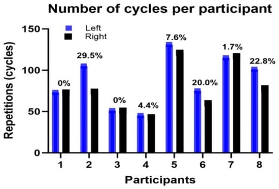 Number of cycles of each participant’s left and right sides during the seated heel-rise test. Note: the percentages indicate the intra-subject inter-limb variation (i.e., between the left and right sides).