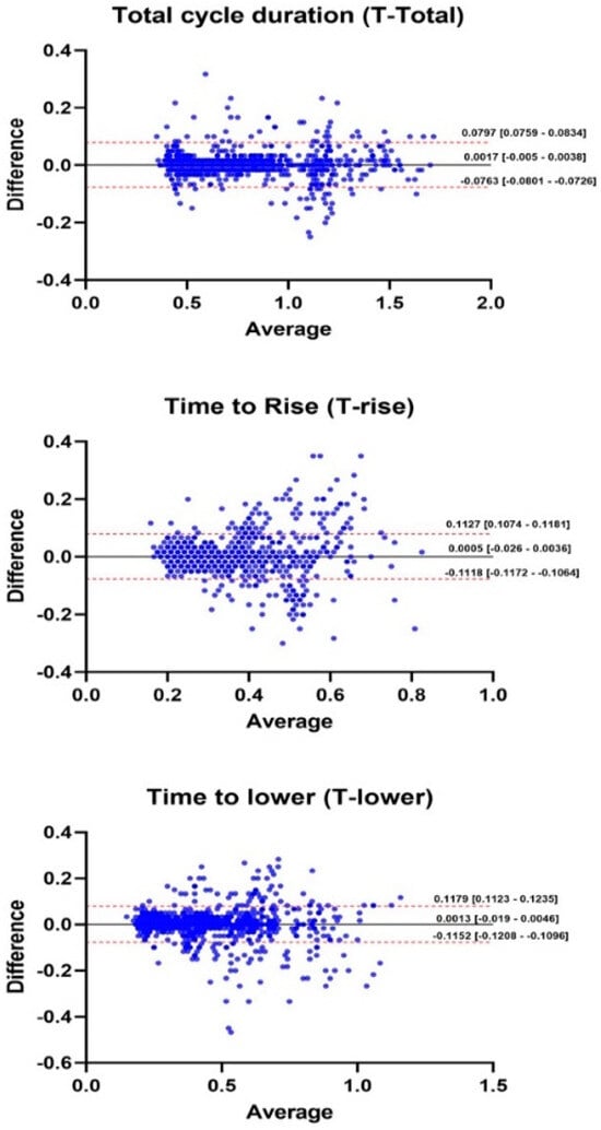 Bland-Altman plots considering all cycles performed by all participants (n = 1313 cycles) during the seated heel-rise test.