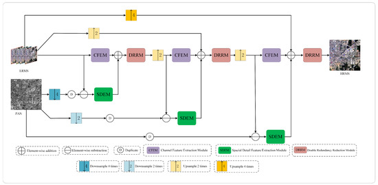 The architecture of the proposed method is depicted in Figure 1 and comprises three similar subnetwork structures. Each subnetwork is designed to extract spectral and spatial information at different scales using the CFEM and the SDEM, respectively. According to the Wald [46] protocol, the multispectral (MS) images and panchromatic (PAN) images, which are processed separately, are treated as original images within this network model. The term Fusion ( i ) denotes the fusion outcome of the i-th stage. The symbols X r and X r indicate the operations of upsampling by a factor of r and downsampling by a factor of r, respectively, to X . The notation X · refers to processing by a specific module that we designed, with all subsequent occurrences X · sharing the same meaning. CFEM mainly captures spectral information between channels, while LRMS , Fusion ( 1 ) 2 , and Fusion ( 2 ) 2 are all multi-band images. These multi-band images have rich spectral information between different channels. At the same time, in order to maintain the size of the feature maps processed in each stage and obtain spectral information of different sizes, at the first, second, and third stages, the inputs for the CFEM are LRMS , Fusion ( 1 ) 2 , and Fusion ( 2 ) 2 , respectively. To mitigate the issue of spectral distortion that is often encountered in detail-injection-based models as discussed in DFPN [41], according to the idea of detail feature extraction and injection from Formula (4) in Part A of a related work, the inputs for the SDEM at these stages are PAN 4 LRMS , PAN 2 Fusion ( 1 ) 2 , and PAN Fusion ( 2 ) 2 , respectively. This strategy ensures that spectral information is effectively integrated into the detail extraction process while obtaining source detail information of different sizes. In addition, in each stage, the output detail information of SDEM is injected into the spectral features extracted by CFEM. Additionally, each subnetwork utilizes a DRRM to eliminate redundant information and enhance the depiction of spectral and spatial information in the fused images. Furthermore, to fully capitalize on the information available in the source images, each subnetwork receives LRMS and PAN images that have been either upsampled or downsampled to match the scale processed by the respective subnetwork. In summary, the operations of our proposed network model are formally expressed by Formulas (5)–(7):