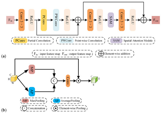 To simplify the representation, Re Lu C o n v 3 × 3 ( · ) is abbreviated as R C ( · ) . To further refine the extraction of spatial details and enhance the focus on positional information within images, we incorporate a spatial attention mechanism [34], as depicted in Figure 3b. Specifically, for the obtained feature maps F 1 R C × H × W , both max pooling and average pooling operations are conducted along the channel dimension. This results in F 1 M R 1 × H × W (representing the maximum pooling feature of the channel) and F 1 A R 1 × H × W (representing the average pooling feature of the channel). These two feature maps, F 1 M and F 1 A , are then concatenated and subsequently passed through a convolutional layer followed by a sigmoid activation function to produce a spatial weight map W R 1 × H × W . This procedure is mathematically formulated in Equation (11):