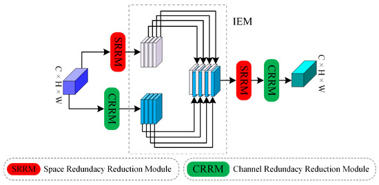 Numerous studies [53,54] have demonstrated that DCNNs often harbor a considerable amount of redundant information. As discussed earlier in this article, both the CFEM and SDEM incorporate skip connections to preserve original image information, which inadvertently introduces a significant amount of redundancy. When the outputs of these two branches are combined, redundancy inevitably arises. Inspired by SCconv [55], which implements a novel CNN approach to simultaneously reduce spatial and channel redundancy, we design the DRRM, as depicted in Figure 4. The DRRM is structured in three stages: initially, channel and spatial information are reconstructed separately through the channel redundancy reduction module (CRRM) and the spatial redundancy reduction module (SRRM), respectively; this is followed by the information exchange module (IEM), wherein channel and spatial information interact comprehensively; finally, as spatial redundancy persists in the feature maps processed by the CRRM and channel redundancy persists in those processed by the SRRM, sequential processing of the SRRM and CRRM refines the feature maps in both the channel and spatial dimensions. In the following sections, we provide detailed descriptions of the SRRM, CRRM, and IEM.