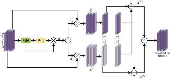 In Equation (13), the feature maps for which w r 1 2 contain rich spatial information, whereas those for which w r < 1 2 are characterized by sparse spatial information. Additionally, executing the inverse gating operation relative to the initial procedure results in a non-informational weight W 2 . Subsequently, the input feature map X is multiplied by W 1 and W 2 , respectively yielding X 1 W , which exhibits strong spatial expressiveness, and X 2 W , which contains minimal spatial information.