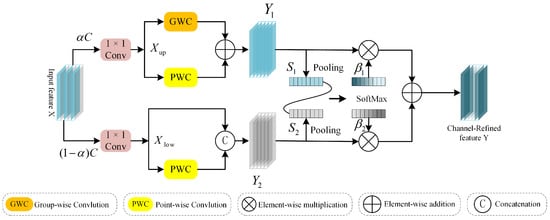 The channel redundancy reduction module (CRRM) is designed to perform segmentation, transformation, and fusion operations on the input feature map, as depicted in Figure 6. The segmentation process involves dividing the channel into two groups with channel counts of α C and ( 1 α ) C using the partitioning factor α , followed by applying 1 × 1 convolution kernels to compress the channels of the two groups of feature maps, respectively, resulting in X up and X l o w . The transformation process uses X up as the input for “rich feature extraction”; X up performs group convolution operations and pointwise convolution operations separately and then combines them to produce Y 1 . Simultaneously, X l o w serves as a supplementary input to the “rich feature extraction”; it undergoes pointwise convolution operations, and the results are concatenated with X l o w .