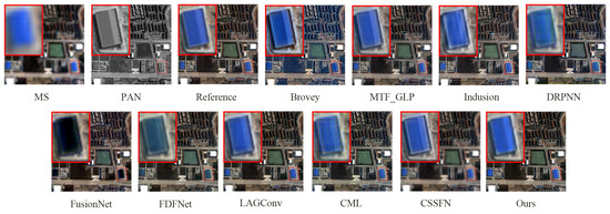 Figure 15 shows the fusion results of various methods on the real dataset of WV2. Like Figure 13 and Figure 14, there are no reference images in the real dataset. Spatial information refers to PAN images, while spectral information refers to MS images. Clearly, the color in Brovey’s fusion result is overall darker. The following analysis is based on the enlarged regions. The spectral information of buildings in the fusion results of DRPNN and FusionNet is severely distorted and does not match the corresponding spectral information in the MS images. The spectral information in the fusion results of MTF_GLP also differs to some extent from the corresponding spectral information in the MS images. The contour of the building in the fusion result of Infusion is blurred, while the spectral and spatial information of the other methods is well preserved. However, the fusion result of our proposed method is a more vivid fusion image, and Table 6 also shows that the proposed method has certain advantages overall.