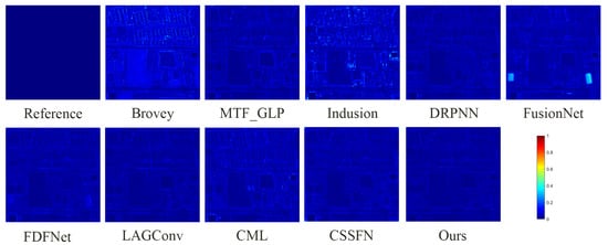 Figure 12. The absolute error maps between the fusion results of all methods and the reference image on the WV2 simulation dataset.