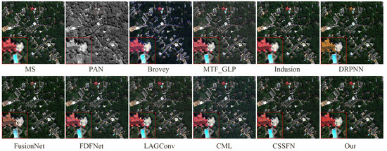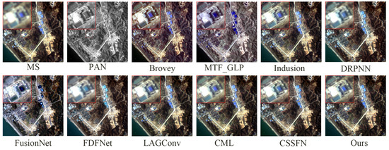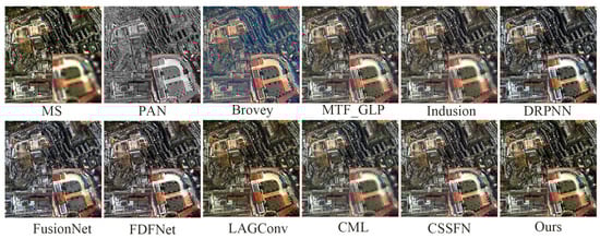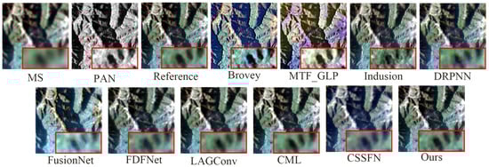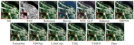 This article compares the effectiveness of our proposed method with several classic techniques including Brovey [11], MTF_GLP [13], Indusion [14], DRPNN [27], FusionNet [35], FDFNet [29], LAGConv [30], CML [31], and CSSFN [32]. Among these, Brovey, Indusion, and MTF_GLP are traditional methods, whereas the others are DL-based approaches.