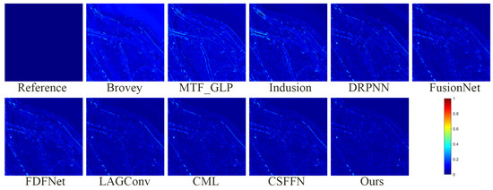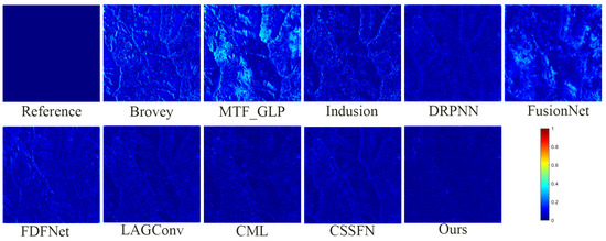 Figure 10. The absolute error maps between the fusion results of all methods and the reference image on the GaoFen1 simulation dataset.