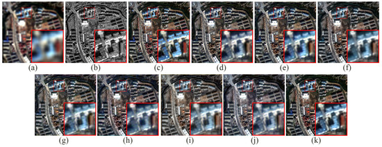 Figure 16. The fusion results after the removal of certain modules. (a) LRMS image, (b) PAN image, (c) reference image, (d) w/o DRRM, (e) w/o CFEM, (f) w/o SDEM, (g) w/o (SDEM + DRRM), (h) w/o (CFEM + DRRM), (i) w/o (CFEM + SDEM), (j) none_modules, and (k) ours.