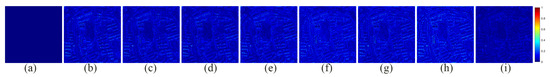 Figure 17. Residual plots comparing the outcomes of the experiments with different module omissions against the reference image. (a) Reference image, (b) w/o DRRM, (c) w/o CFEM, (d) w/o SDEM, (e) w/o (SDEM + DRRM), (f) w/o (CFEM + DRRM), (g) w/o (CFEM + SDEM), (h) none_modules, and (i) ours.