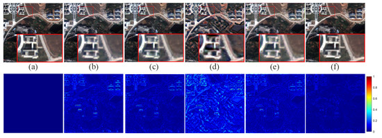 Figure 18. The output results of the various network structures along with their residual plots relative to the reference image. (a) Reference image, (b) concatenation, (c) direct injection, (d) one-stage, (e) two-stage, and (f) Ours.