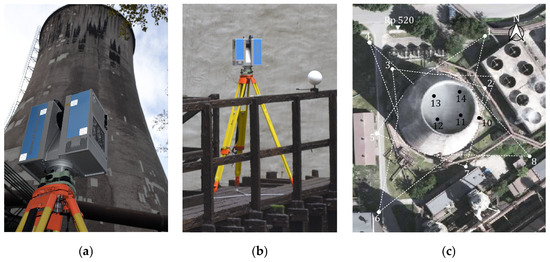 We scanned the test cooling tower with a Z+F Imager 5010 (Figure 1a,b) referenced to a stable, ten-point observation network with a reference frame tied to the local facility control network situated out of the process impact zone. The employed instrument, a Z+F Imager 5010, offers a maximum measurement range of 187.3 m, a spherical field of view (360° horizontally and 320° vertically), and a data acquisition rate of up to a million pixels a second. The angular accuracy of the device is 0.007° RMS, and its linearity error is below 1 mm at 50 m. The low level of noise facilitates the highest quality of data (the noise range at 50 m is 0.8 mm, 1.2 mm, and 2.7 mm for 80%, 37%, and 14% albedo, respectively). The instrument has a dual-axis compensator with a 0,007° accuracy and a laser plummet for a plummet accuracy of 0.5 mm/m. The IP53 protection class guarantees high dust and water tightness, which is a must in industrial settings. (The IP53 protection class protects against the ingress of particulate matter and liquids. It guarantees the isolation of dust and spray of water from any angle from 60° to vertical on all sides).