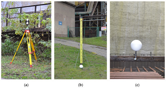 The planar positions of the scanner and targets were assumed per the horizontal coordinates of the observation network points. Their heights were measured through trigonometric levelling, factoring in laboratory-determined offsets: reflector–target–scanner. Additionally, to control the constant height of the scanner and targets, we employed original specially made 150 mm steel spheres with adapters to ensure they sat stably in the field (Figure 2b). The spheres were distributed evenly around the cooling tower and precisely levelled with Leica NA3003 by placing Leica GPCL2 invar bar code staffs directly on the reference spheres (Figure 2b). Each measurement was referenced to the benchmark Rp 520 (Figure 1c) (the tie-in point for all research projects), assuming a 0.2 mm tolerance for double measurement. The heights of the centres of the spheres in the frame of reference were identical to the centroids of the sphere models, thus ensuring height control for the TLS data. The reference spheres were also used as points for tying adjacent point clouds to improve registration.
