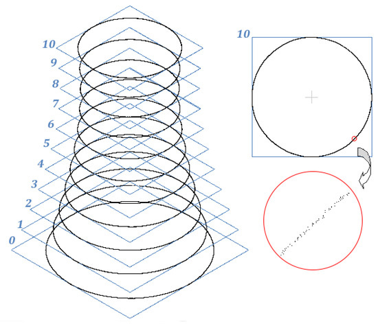The problem was solved by estimating coordinates , of the origins of the horizontal cross-sections and components of axial deviation from plumb (). The solution was to determine the parameters of approximate circles based on points on each level with the least-squares method. We took eleven 5-millimetre, manually extracted sections of a point cloud projected onto a plane of each level (Figure 3) to ensure a sufficient number of observations defining the structure’s sections. The heights of the levels (at 6.5 m intervals) were selected to facilitate identifying alarming signs of structural deformations (lateral drift and ovalisation) while minimising the analytical effort. The unknown parameters of the i-th level were the coordinates , of the origin and the radius . Our calculations based on the planar coordinates of the point cloud sections employed a parametric circle equation: