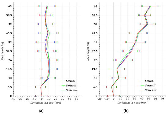 The deviation of the structure’s axis from plumb was determined by the shifts in the origins of the circles extracted from point cloud sections on ten levels. The components of the structure’s lateral drift determined by the shifts in the origins of the i-th cross-section compared with the origin of the zero cross-section are presented as lateral drift plots in the ZX plane and ZY plane, taking into account the accuracy of fitting (with the standard deviation represented as an error bar in millimetres [45]) (Figure 5).