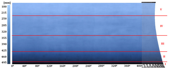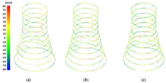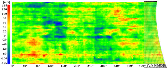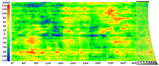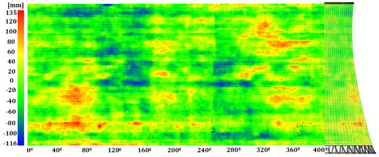 The reinforced-concrete shell thickness was determined from the TLS data based on an estimation of the distance between point clouds of the internal and external surfaces of the structure. The TLS datasets could be differentiated with an accuracy exceeding the nominal accuracy of individual points in the cloud and factoring in sources of uncertainties thanks to the M3C2 algorithm. To ensure the reliability of the approach, it was necessary to keep the differentiated point clouds coherent, as demonstrated in the analysis of the divergences identified in coordinates , () of the origins of the ten circles estimated from sections of the oriented TLS data. The results could be visualised in three dimensions because every point of the external surface cloud (the result set) was assigned a specific value of shell thickness (scalar field). Considering the popularity of planar representations of the condition of a hyperboloidal shell in construction practice, we also present the results in a two-dimensional map. The shell thickness map is a metric projection of scalar field points onto the side of a cylinder with the base identical to the lower edge of the tower shell developed along it onto a plane (Figure 9).