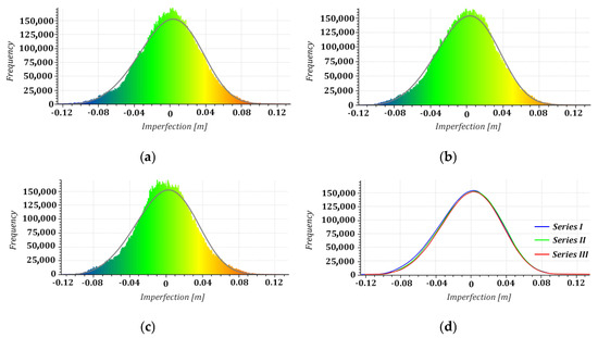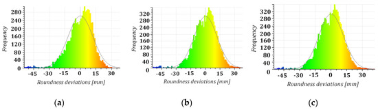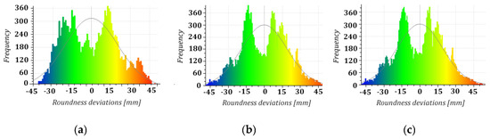 Distribution of roundness deviations in horizontal cross-section 9: (a) series I; (b) series II; (c) series III.