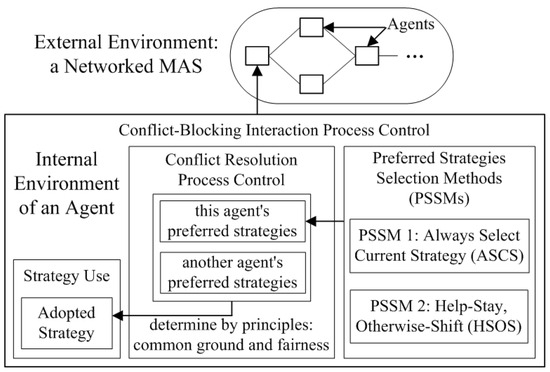 A conflict resolution process is performed by interacting agents when a conflict occurs. A conflict means that the agents adopt different strategies according to Proposition 1. To resolve the conflict, the agents need to adopt the same strategy. For the question of which strategy to adopt, an agent prefers some particular strategies, named preferred strategies. An example preferred strategy is the agent’s current strategy, which shows the agent’s incentive of avoiding strategy-changing costs. This example indicates that the interacting agents might have different preferred strategies. If so, the agents need to make an agreement about which preferred strategy to adopt. To make such agreements, the agents can use two principles: common ground and fairness. Both can be widely used in human societies.