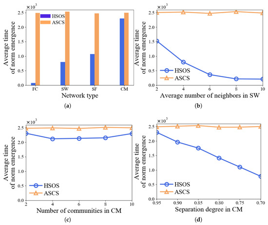 In this experiment, n is set to values in . Figure 5a demonstrates that HSOS accelerates norm emergence faster than ASCS across different n values and network types. The time for ASCS grows quadratically with n, as discussed in Factor 3. For HSOS, a quadratic growth influence on time is also observed in SW, SF, and CM due to the use of SCS. In FC, Figure 5b shows a linear growth influence, indicating significantly faster norm emergence in large n settings compared to other networks. However, FC is less common due to its strong requirements in MASs. Future work should aim to achieve linear or near-linear growth influence in more common networks like SW, SF, and CM.