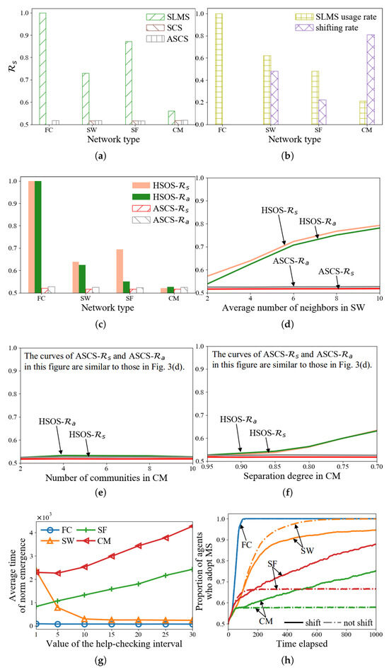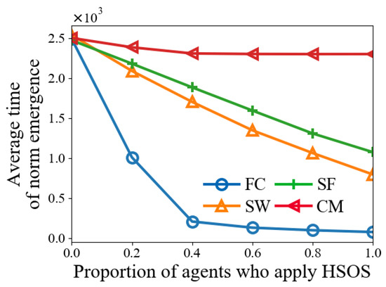 In this experiment, h is set in . Figure 8 shows that norm emergence is faster with higher h values across four network types. More HSOS agents lead to a greater reduction in norm emergence time. The maximum time reduction for a network type can be calculated by the time difference between and . In SW and SF, the time reduction is almost linear with increasing h, while in FC and CM, the time reduces more quickly. These results indicate that even a small proportion of agents applying HSOS can significantly reduce the norm emergence time, suggesting a trade-off between agent ability and time reduction.