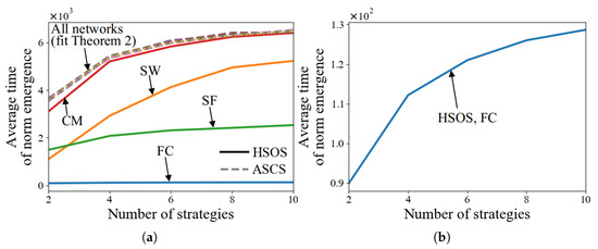 Figure 5b also indicates the theoretically minimum time for norm emergence, showing that when and each of two strategies is initially adopted by 50 agents, the least number of conflict resolution processes needed is 50. The time in FC is longer than this theoretical minimum because agents may not adopt the same MS after their first conflict resolution processes.