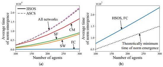 Average time of norm emergence of HSOS and ASCS with various numbers of agents (a,b).