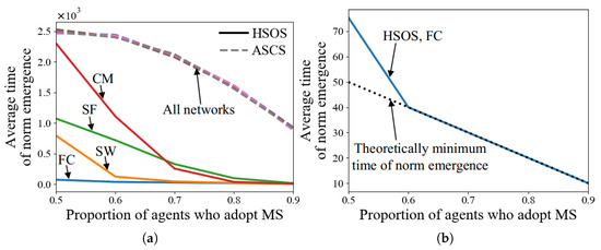 Average time of norm emergence of HSOS and ASCS with various proportions of agents who adopt MS (a,b).