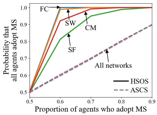 Figure 6b shows that when , the time of HSOS in FC reaches the theoretically minimum value, as all agents can observe and adopt the same MS at their first conflict resolution processes. Additionally, influences the probability that agents adopt a particular strategy after norm emergence. Figure 7 illustrates this probability in terms of adopting MS, showing that for ASCS, the probability aligns with , while for HSOS, the probability increases more quickly with a higher due to SLMS usage and finding common ground.