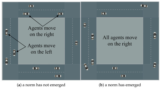 The primary purpose of the simulator is to vividly illustrate the process of norm emergence through conflict-blocking interactions. Figure 9a,b show two example road situations. A vehicle (agent) can choose to move either on right side or on left side of the road. When two vehicles move toward each other, they perform a passing (conflict-blocking) interaction. The proposed framework is applied by vehicles to perform the interactions (where ASCS is used as the preferred strategy selection method). Vehicles continuously interact with each other and resolve conflicts if necessary, and the road changes from a no-norm situation to a norm situation, as shown in Figure 9a,b, respectively.