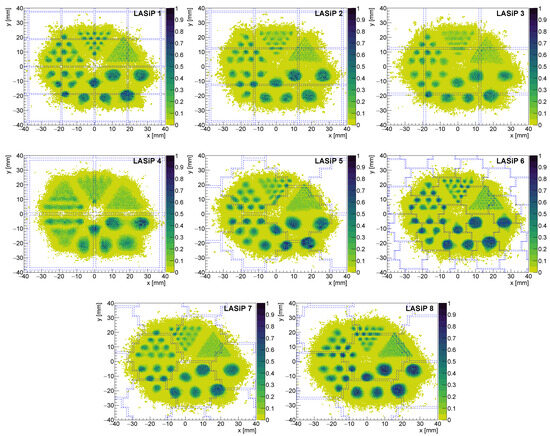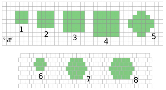 The SiPMs were arranged in two ways, following a square and a honeycomb geometry (see Figure 1). The SiPMs could then be summed and grouped to build LASiPs of different size and shape. All the LASiPs we built are listed in Table 1 and illustrated in Figure 1. LASiPs 1–4 and LASiPs 6–8 follow the ‘natural’ square/honeycomb geometry of the simulated SiPMs. In the case of LASiP 5, the SiPMs were placed in the camera following a square geometry, but were grouped in a way we called ‘flower’ geometry.