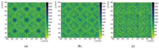 To build the uniformity correction map, we simulated a flat-field image (FFI). We reconstructed it, applied linearity correction, normalized it and finally inverted it. All reconstructed images were multiplied by this map (also here see [2] for more details). Figure 2 shows an example of a simulated FFI reconstructed with LASiP 2 pixels and without noise at three different stages: the raw reconstruction obtained after minimizing Equation (3) for each event (Figure 2a), after linearity correction (Figure 2b) and after uniformity correction (Figure 2c).