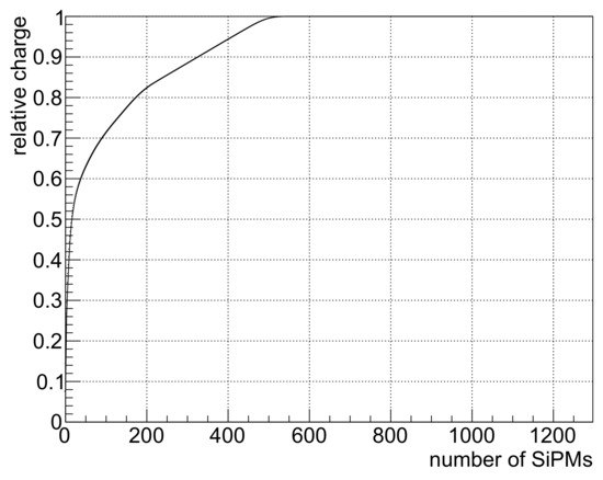 Collected charge (relative to the total number of collected photons) as a function of the number of SiPMs used to collect the charge.