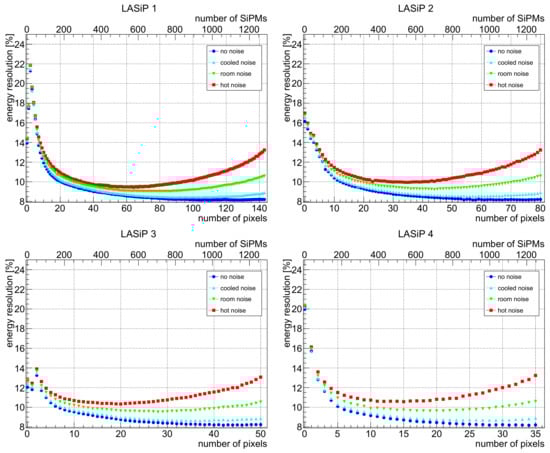 Energy resolution as a function of the number of LASiPs used to collect the charge (LASiP 1–4) under different SiPM noise levels. The top x axis shows the total number of SiPMs employed.