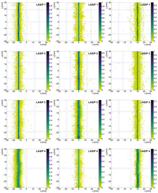 To study the impact of the pixel size in the spatial resolution we compared the images obtained with all the pixels with square geometry (LASiP 1–4). Figure 5 shows the reconstructed images of capillary sources at different x positions ( mm) at room-SiPM noise. It can be qualitatively observed that the width of the reconstructed capillary increases with the pixel size. Additionally, when comparing the images reconstructed with the same LASiP, a dependence of the capillary width on its position in the y axis can also be appreciated. As will be discussed shortly afterwards, the spatial resolution seems to be worse when the capillary passes close to a pixel center.