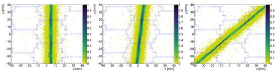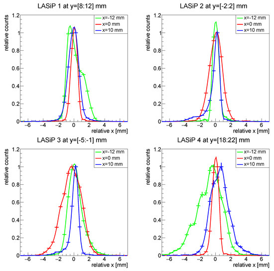 Figure 6 shows the projections in the x axis of all the images of Figure 5. To facilitate the comparison, all projections were shifted to be centered at . To perform these projections, we selected only events with reconstructed y values within 2–3 mm from the coordinate of one of the pixels (see title of each panel in Figure 6). This was a conservative choice since, as can be inferred from Figure 5 and Figure 6 and as is discussed shortly after, the spatial resolution is better when the capillary appears close to a pixel edge than when it passes close to its center.