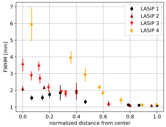 Figure 7 compares the average FWHM of the capillaries reconstructed with LASiPs 1–4 as a function of the normalized distance to the center of the pixel . is given in units of the pixel size. This way, describes a capillary passing by the center of a pixel, while describes a capillary at the edge, equidistant from two pixels. As expected, smaller pixels provide a better intrinsic spatial resolution, which can be below 2 mm for LASiP 1. Still, for LASiP 3, which is almost 3 times larger than LASiP 1 and 25 times larger than a commercial SiPM of , the intrinsic spatial resolution would be below 3 mm over almost all the area of the camera. The intrinsic spatial resolution is significantly worse for LASiP 4, although still acceptable if we compare it with standard SPECT scanners based on PMTs.