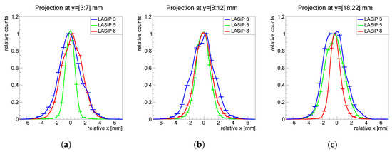Normalized projections in the x axis of the reconstructed images of capillaries passing through the center of the LASiP 3, LASiP 5 and LASiP 8 pixels. The projections were centered at different y values: (a) mm, (b) mm, (c) mm.