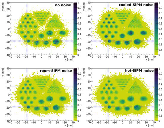 Figure 11 shows the reconstructed image of the simile-Derenzo source with LASiP 3 at different noise levels. There is a small degradation of the spatial resolution when going from cooled to room SiPM noise, which can be observed in the 2 mm circles. The degradation is naturally larger for hot SiPM noise.