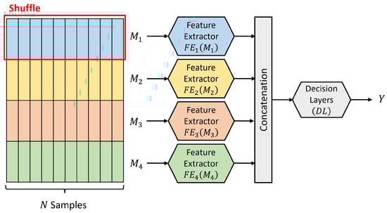 Data fusion in multimodal systems can take place at three different levels: (i) early fusion or data-level fusion; (ii) intermediate fusion or network-level fusion; and (iii) late fusion or decision-level fusion [11]. Data-level fusion consists of combining information or features from different modalities at the raw input level to obtain a better representation of the data prior to the machine learning model [17,18]. Network-level fusion combines information from different modalities within the machine learning model via various mechanisms [19]. Concatenating high-level features or feature embeddings from different modalities within the model is one of the most common methods of network-level fusion. Decision-level fusion takes place at the decision level, where the decisions from multiple unimodal machine learning models are fused into a common decision [19,20]. This work focuses on network-level fusion because it can effectively exploit complementary information from different modalities, learning a joint representation of the multimodal data while being flexible enough to incorporate modality-specific features.