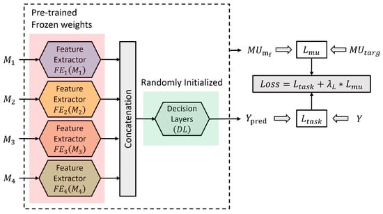 The modality utilization-based training method targets the decision layers of the fusion network to regulate the utilization of the fusion network on its input modalities. Thus, pre-trained frozen weights from the unimodal models are used as feature extractors (highlighted in red in Figure 2), and only the decision layers are trained (highlighted in green in Figure 2). This approach ensures that the quality of the feature embeddings from each modality is not affected by the modified loss function while allowing for a change in network utilization of its various input modalities.