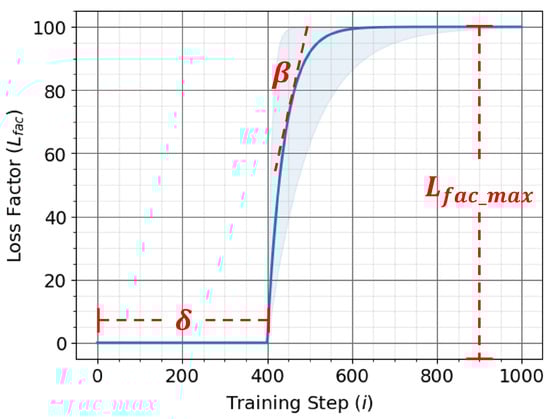 where is the maximum value of the loss factor, is the buildup rate of the loss factor from 0 to , and is the buildup delay when the loss factor starts increasing exponentially from zero. Figure 4 shows a visualization of the exponential-based loss factor function and hyperparameters. An understanding of the complexity of the task and the architecture of the fusion network can guide the selection of the hyperparameter values.