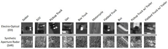 The NTIRE21 dataset [15] presents a classification problem in the domain of aerial imagery. The dataset consists of aerial views of 10 classes of vehicles: sedan, SUV, pickup truck, van, box truck, motorcycle, flatbed truck, bus, pickup truck with trailer, and flatbed truck with trailer. The multimodal dataset features two modalities: (i) Electro-Optical imagery (EO), and (ii) synthetic aperture radar imagery (SAR). Electro-Optical imagery (EO) is a still image photographic sensing, where the incoming light is converted into electrical signals. Synthetic aperture radar (SAR) is an active imaging method, where the sensor uses microwave radar signals emitted towards Earth to capture surface properties. Figure 5 provides a preview of the NTIRE21 dataset.