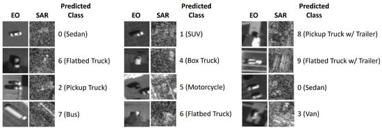 Unimodal networks for EO and SAR modalities were trained with ResNet18 [55] as the backbone of the network to obtain the pre-trained feature extractors for the multimodal fusion network. The multimodal fusion network (see Figure 6) consisted of two ResNet18-based pre-trained feature extractor branches for each modality, followed by a flattening layer, concatenation, and a fully connected layer with 512 neurons and a softmax activation function for classification. The network was trained over 250 epochs with an Adam optimizer and a learning rate of 0.001. A significant class imbalance exists in the NTIRE21 dataset, with the Sedan class consisting of 234,209 samples while the Bus class consisting of only 624 samples. To address this, only the first 624 samples from each class were used for this study. Specifically, 524 samples from each class were used for training, while 100 samples were used for testing. Models with the highest classification accuracy and the lowest modality utilization loss () are saved for further analysis. Additionally, early stopping is employed to prevent overfitting. Figure 7 provides an intuitive demonstration of the predicted classification on the NTIRE21 dataset using the Multimodal Aerial View Object Classification Network.