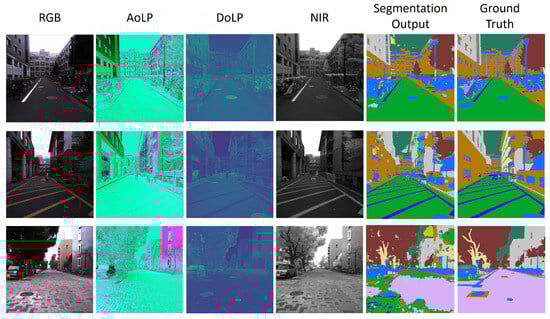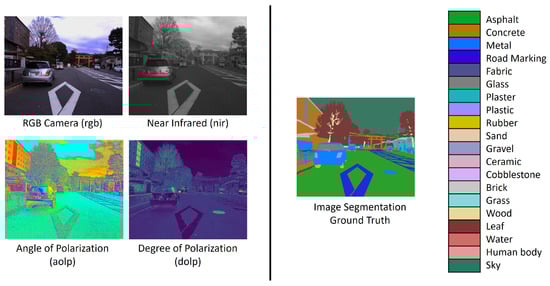 Unimodal networks for the RGB, AoLP, DoLP, and NIR modalities were trained with U-Net [56] as the backbone of the network to obtain the pre-trained feature extractors for the multimodal fusion network. The multimodal fusion network (see Figure 9) consisted of four UNet-based pre-trained feature extractor branches for each modality, followed by a concatenation layer, two batch normalization and 2D convolution layers alternately, and a ReLU activation function for image segmentation. The two 2D convolution layers comprised a 3 × 3 × 300 and 1 × 1 × 20 filter size, respectively, with a stride of 1. Training lasted 500 epochs with SGD optimizer (lr: 0.05, momentum: 0.9) on a dataset split into 302 training, 96 validation, and 102 testing samples. Models with the highest mean Intersection over Union (mIoU) and the lowest modality utilization loss () are saved for further analysis. Additionally, early stopping is employed to prevent overfitting. Figure 10 provides an intuitive demonstration of the image segmentation on the MCubeS dataset using the Multimodal Material Segmentation Network.