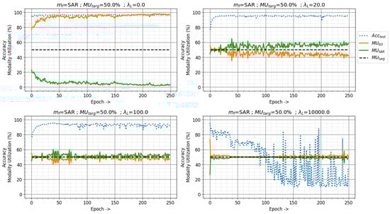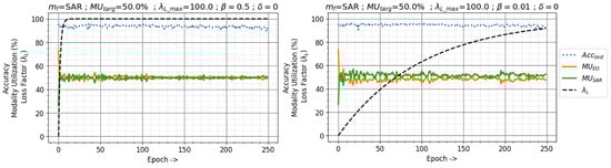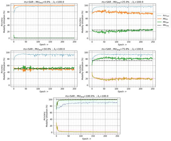Given a target utilization and loss factor , the utilization of a multimodal fusion network on the input focus modality can be manipulated using Algorithm 2. The classification network for NTIRE21 dataset is trained with SAR as the focus modality (), and loss factor for different values of target utilization , shown in Figure 11. The network can be observed maintaining the SAR modality utilization (green line) close to the target utilization (black dashed line) while maintaining a performance similar to the baseline methods. The network performance converges to the baseline performance quickly since pre-trained frozen feature extractors are used for this study. Table 2 summarizes the performance and the modality utilization of the network on EO and SAR modalities achieved for different . A drop in performance is observed when the network starts to rely heavily on the non-dominant modality. The performance is bounded by the unimodal SAR performance at . A small difference can be noticed between target modality utilization SAR and as the modality utilization-based training method minimizes the difference between and while also solving the fusion network task. A mean difference of 3.73% can be observed between SAR and with a maximum of 7.10% and minimum of 0.59% difference.