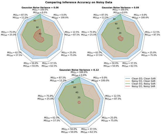 The method allows the multimodal network to be more robust towards the presence of noise, such as clouds and other weather conditions, where the EO modality becomes suboptimal. Hypothesis H2 predicts that the noise robustness of a fusion network, trained using a modality utilization-based training method, will vary depending on the target utilization levels of input modalities when noise is introduced to the input modalities. The results in Figure 14 demonstrate that the presented method can be used to make a network more robust to the presence of noise in one or more modalities by making it less reliant on a dominant modality. The network trained for lower SAR modality utilization performs better than that with higher SAR modality utilization when noise is present in the SAR modality. A similar trend is observed with the EO modality when noise is present in it. This is further validated by Table 7, where a decrease in the utilization of the dominant EO modality decreases the network accuracy when no noise is present. However, the network exhibits a greater degradation in accuracy with higher EO utilization when noise is present in the dominant EO modality. The average optimal EO utilization is revealed to be in the range of 75–87.5%, leveraging the information from the dominant modality while avoiding the overutilization of it. This is an improvement over the traditional training method, which self-optimizes its utilization to be 99.59% utilization of the dominant EO modality, shown in Table 1, making the network susceptible to noise. The array of tests reveals that the network’s performance is degraded by different levels based on the target utilization set for that network, thus supporting hypothesis H2. This indicates that there exists an EO-SAR utilization ratio where the network will be equally robust to the presence of noise in the EO or SAR modality, making it the ideal point to improve the overall network noise robustness.