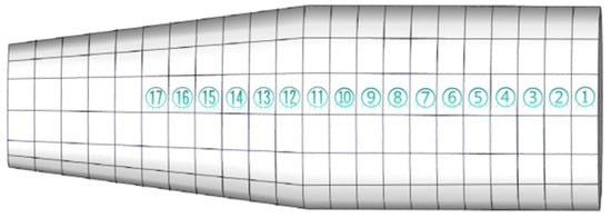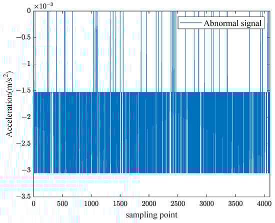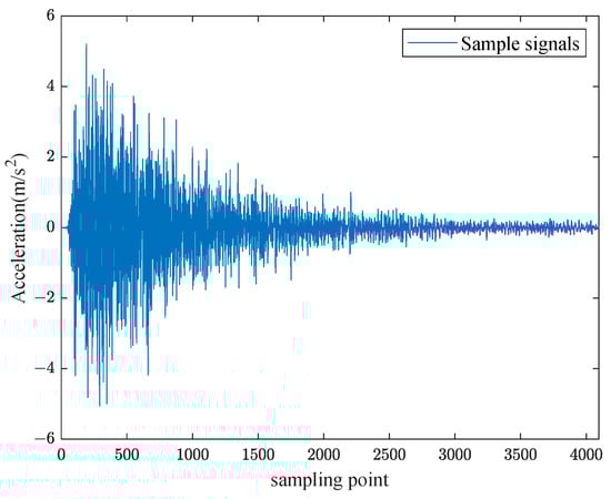 The experimental setup includes one rigid force hammer, two data acquisition devices, one laptop computer, and ninety-four vibration acceleration sensors. The test schematic is shown in Figure 3. Based on the test model of a ship’s stern, an impact load classification and localization model is established. The test model of a ship’s stern is simplified to a combination of a cylinder and cone, with the grid divided horizontally each 0.8 m and vertically each 1 m. The surface of the model is partitioned, and grid areas are numbered, as shown in Figure 4. A rigid force hammer is used to strike the surface of the model structure to simulate the impact of abnormal loads. In Figure 4, each of the squares numbered from ① to ⑰ is struck at five different positions, as indicated by the blue asterisks in Figure 5. Each point is struck three times, resulting in a total of 255 sets of data. In Figure 5, a vibration acceleration sensor is placed in each area, as shown by black circles. Each strike is accompanied by 1 s data collection with a sampling frequency of 13,183 Hz, and the obtained sensor signal data represent the vibration acceleration. A total of 4096 sampling points before and after the occurrence of an impact load, approximately 0.31 s of data, are taken as input samples, as shown in Figure 6. Each sensor serves as an independent sample, and each data sample is labeled, with each label corresponding to the area where the impact load occurred. The total number of samples is 23,970 (255 sets × 94 sensors), and samples with anomalies are excluded, as shown in Figure 7. Ultimately, 21,714 samples are selected for training and validation, with the training and testing sets having a ratio of 7:3.