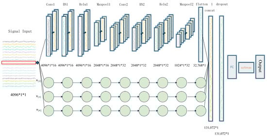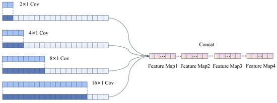 Transitioning from single-scale optimization of a traditional CNN to a multi-scale approach, where each scale operates independently before feature concatenation, performing automatic feature extraction separately, enhances the feature extraction capability. The first convolutional layer of four scales has convolutional kernel sizes that vary, specifically 2 × 1, 16 × 1, 64 × 1, and 128 × 1. Smaller kernel sizes can extract local features, while larger kernel sizes can expand the receptive field, balancing local perception with a global perspective. The pooling layer has a size of 16 × 1, which is moderate and effective in preserving valuable information during the feature extraction process. Two sets of convolutional layers have different convolutional depths. The first layer has a depth of 16, and the second layer has a depth of 32, yielding different feature mappings for a set of input data, balancing the model’s parameters, complexity, and feature extraction capability. The introduction of data standardization and L2 regularization, along with the shuffling of datasets during training, is employed. Data standardization is introduced for data enhancement, L2 regularization is used to suppress overfitting phenomena, and the shuffling of dataset prevents under-training of certain localization areas.