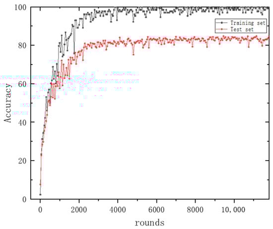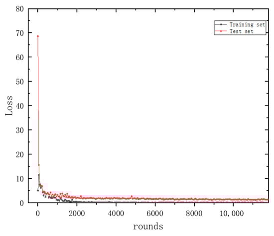 Figure 11 and Figure 12 depict the variations in the accuracy and loss function for the training and testing datasets, respectively. Here, the horizontal axis ‘rounds’ refers to the number of iterations. In other parts of the text, ‘epochs’ denotes the number of times the entire training dataset is completely traversed (i.e., used for training) by the neural network, with one epoch typically encompassing multiple rounds. From these figures, it can be observed that the accuracy and loss function values for both the training and testing datasets tend to stabilize with an increase in the number of iterations (rounds), indicating that the method presented in this paper possesses strong stability.
